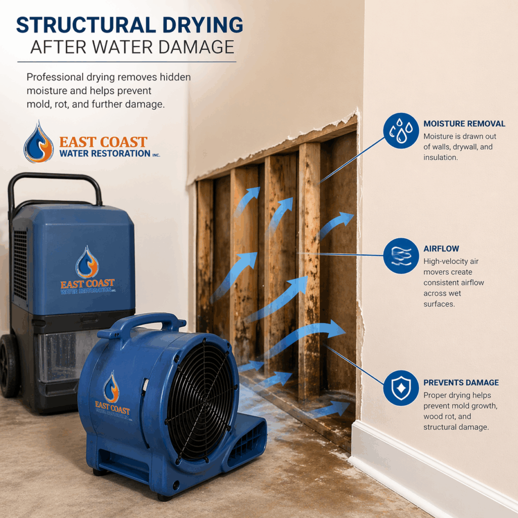 At East Coast, we document moisture readings throughout the process and don’t consider a structure dry until the numbers confirm it. The science only works if you see it all the way through.
